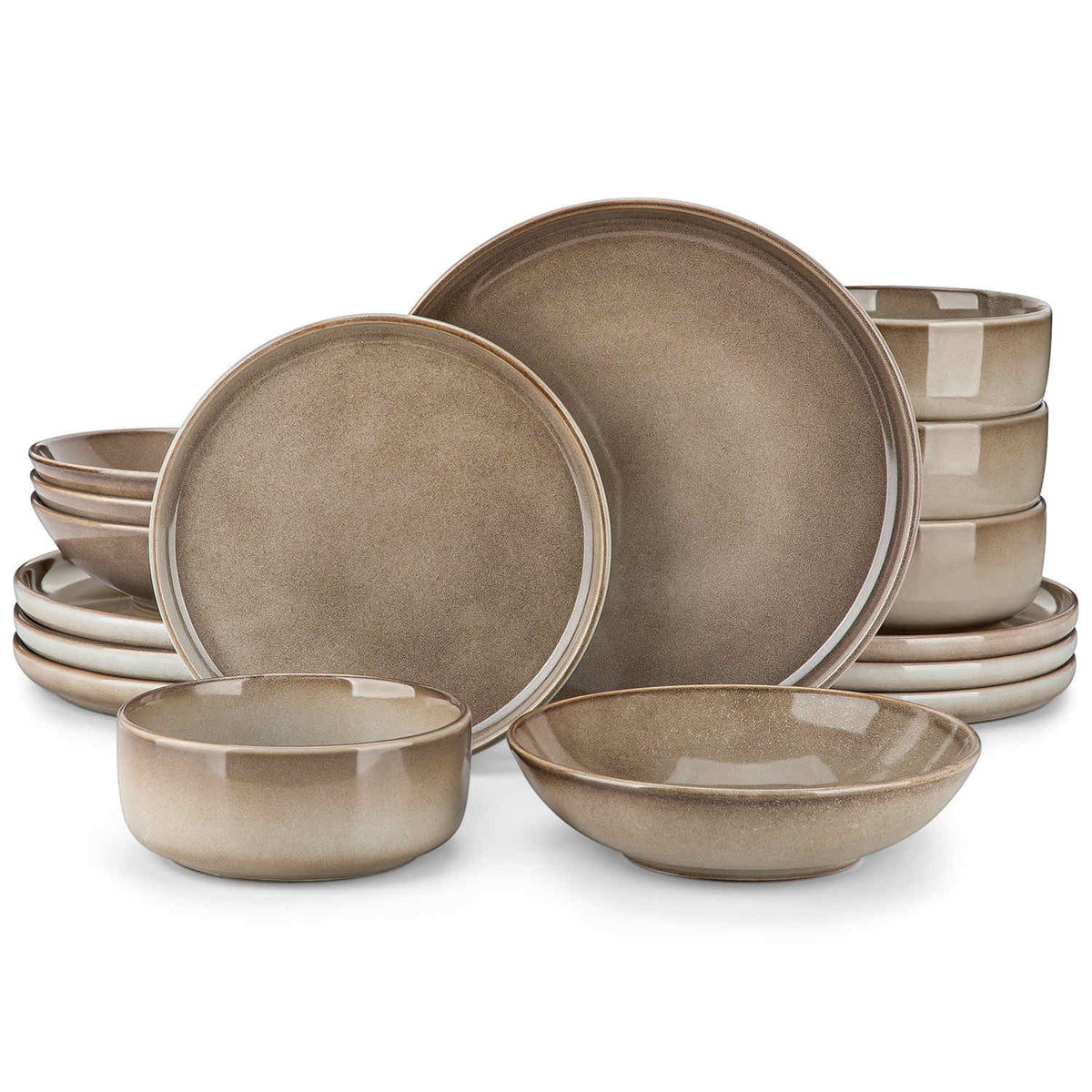 The Playa Collection blends the relaxed charm of Mediterranean style with the contemporary elegance of Modern Ibiza. This 16-piece set features a lipped-edge design and a unique reactive glaze, with interior colors available in blue, light green, dark green, brown, green, grey, caramel, and beige. The set includes dinner plates, dessert plates, soup plates, and cereal bowls for four. The matte black exterior provides a striking contrast, enhancing the set's elegant yet breezy aesthetic. Perfect for everyday dining, it’s microwave, dishwasher, and oven safe, stackable for convenience, and finished with an anti-oil, scratch-resistant coating for easy maintenance and lasting beauty.
