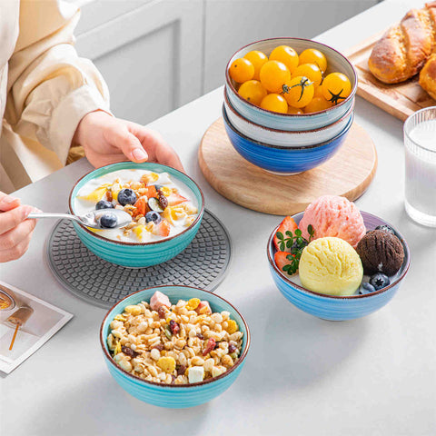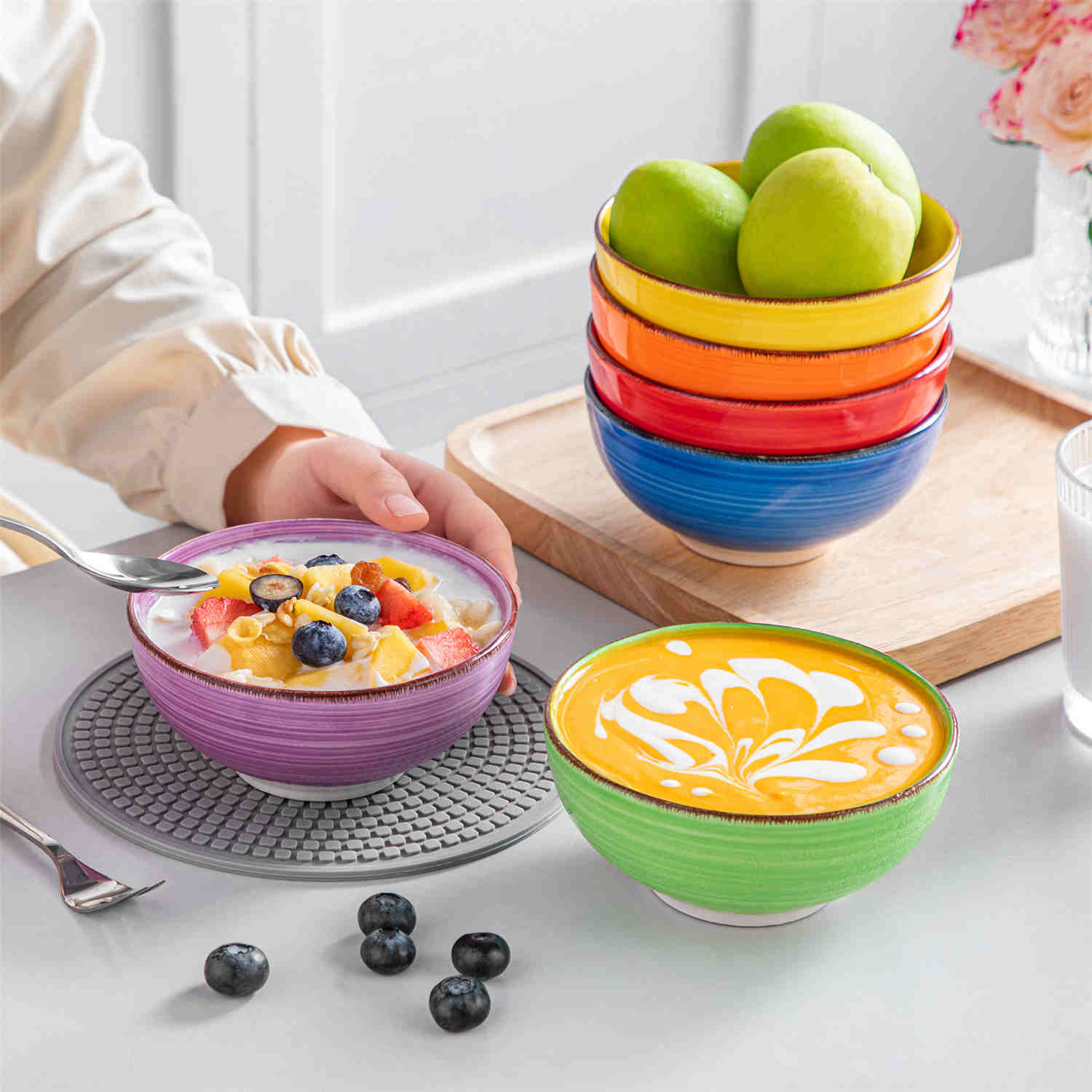 Diese kompakten Mini-Müslischalen, inspiriert von BonitaDie Vintage-Ästhetik besticht durch ein zartes Spiralmotiv und leuchtende Farben, die an einen natürlichen Regenbogen erinnern. Ideal zur Portionskontrolle, perfekt für Müsli, Joghurt, Snacks und mehr. Leicht und handlich, bewahren diese robusten Steinzeugschalen die Frische Ihrer Speisen und verleihen Ihrem Essen eine fröhliche Note. Um die Haltbarkeit zu verbessern und dauerhafte Sauberkeit und Hygiene zu gewährleisten, haben wir die Unterseite jedes Teils mit einer wasserdichten Beschichtung versehen.