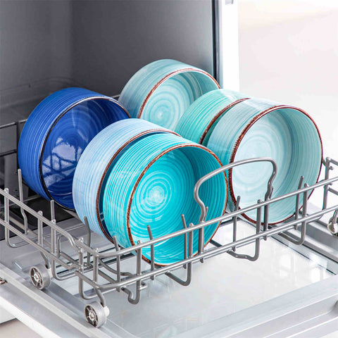 4: Intelligentes Stapeln: Stapeln Sie Ihr Geschirr sorgfältig, um ein Abplatzen oder Kratzen zu vermeiden. Verwenden Sie die Polsterung zwischen jedem Stück, wenn möglich.
