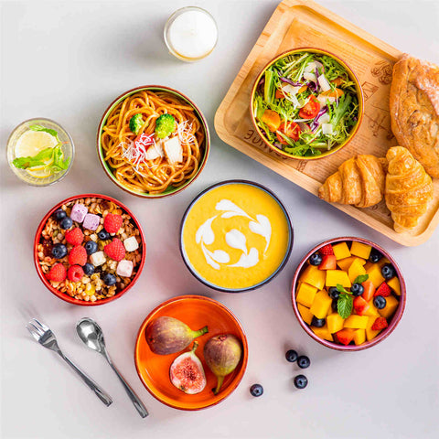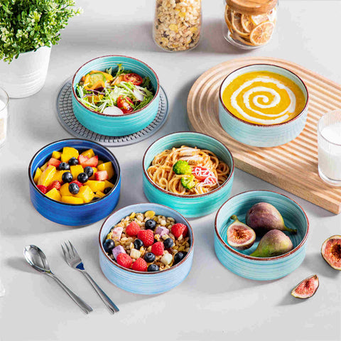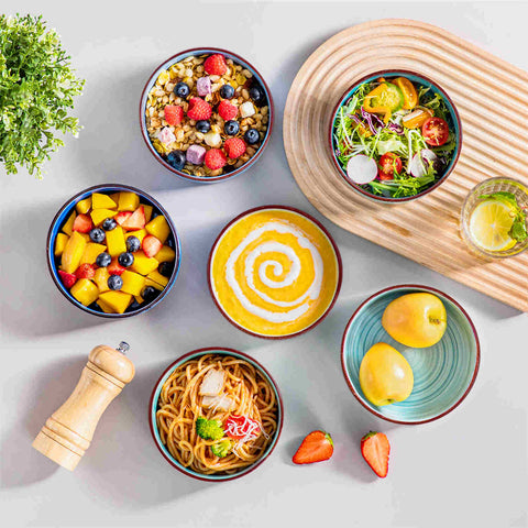 Treten Sie ein in die vielseitige Welt der Bonita 500 ml Müslischalen – Vintage-Charme trifft auf modernes Design. Jede Schale besticht durch ihr schlankes Profil mit geradem Rand, wodurch eine moderne und elegante Silhouette entsteht, die Ihr Esserlebnis bereichert. Die sorgfältig handgefertigten Schalen sind mit einem dynamischen Spiralmotiv verziert und verleihen jeder Mahlzeit künstlerisches Flair. Perfekt für herzhafte Frühstücke, bunte Salate oder erfrischende Desserts. Diese Schalen vereinen Funktionalität mit leuchtenden Farben und eignen sich ideal für den Alltag und besondere Anlässe. Für eine längere Haltbarkeit und dauerhafte Sauberkeit und Hygiene haben wir den Boden jedes Stücks mit einer wasserfesten Beschichtung versehen.