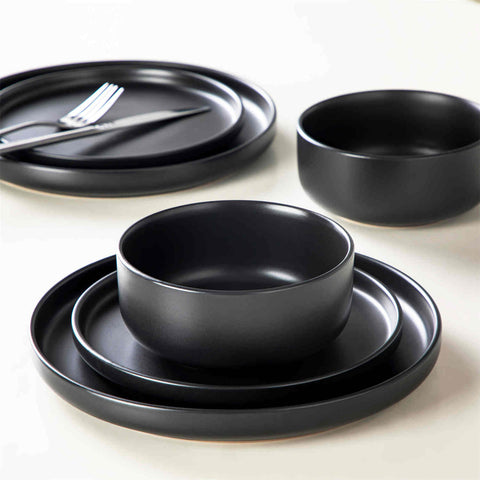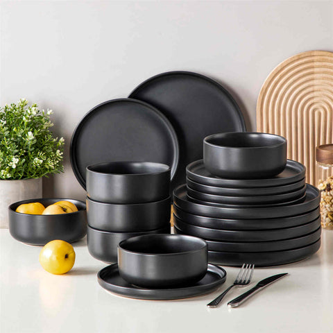 Playa 18-Piece Stoneware Dinnerware Set for 6, featuring plates and bowls in a modern Ibiza-inspired style with a matte black finish-vancasso