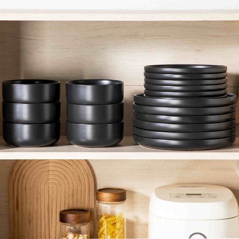 Playa Das matte Steingut-Set besticht durch sein markantes schwarzes Design und eine elegante, moderne Ästhetik. Jedes Teil verfügt über einen minimalistischen Rand und strahlt einen raffinierten, zeitgenössischen Stil aus. Das Set umfasst Essteller, Dessertteller und Müslischalen für sechs Personen und eignet sich perfekt für den Alltag und die Unterhaltung. Praktisch und vielseitig: Es ist mikrowellen-, spülmaschinen- und ofenfest, stapelbar und mit einer fett- und kratzfesten Oberfläche für einfache Pflege und lange Haltbarkeit versehen.
